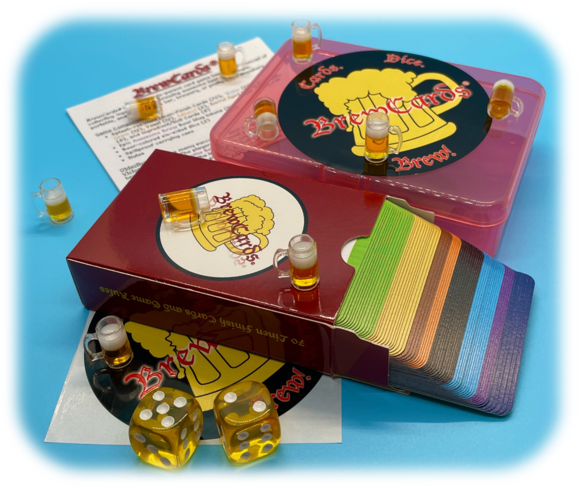Play BrewCards in a pub or at home. Quick to learn and easy to play, the game consists of a pocket sized spill-proof box, 70 splash-resistant linen finish cards, two beer-colored dice, ten miniature Awesome Brew mug tokens, rules, and a beer-fridge ready logo sticker. |